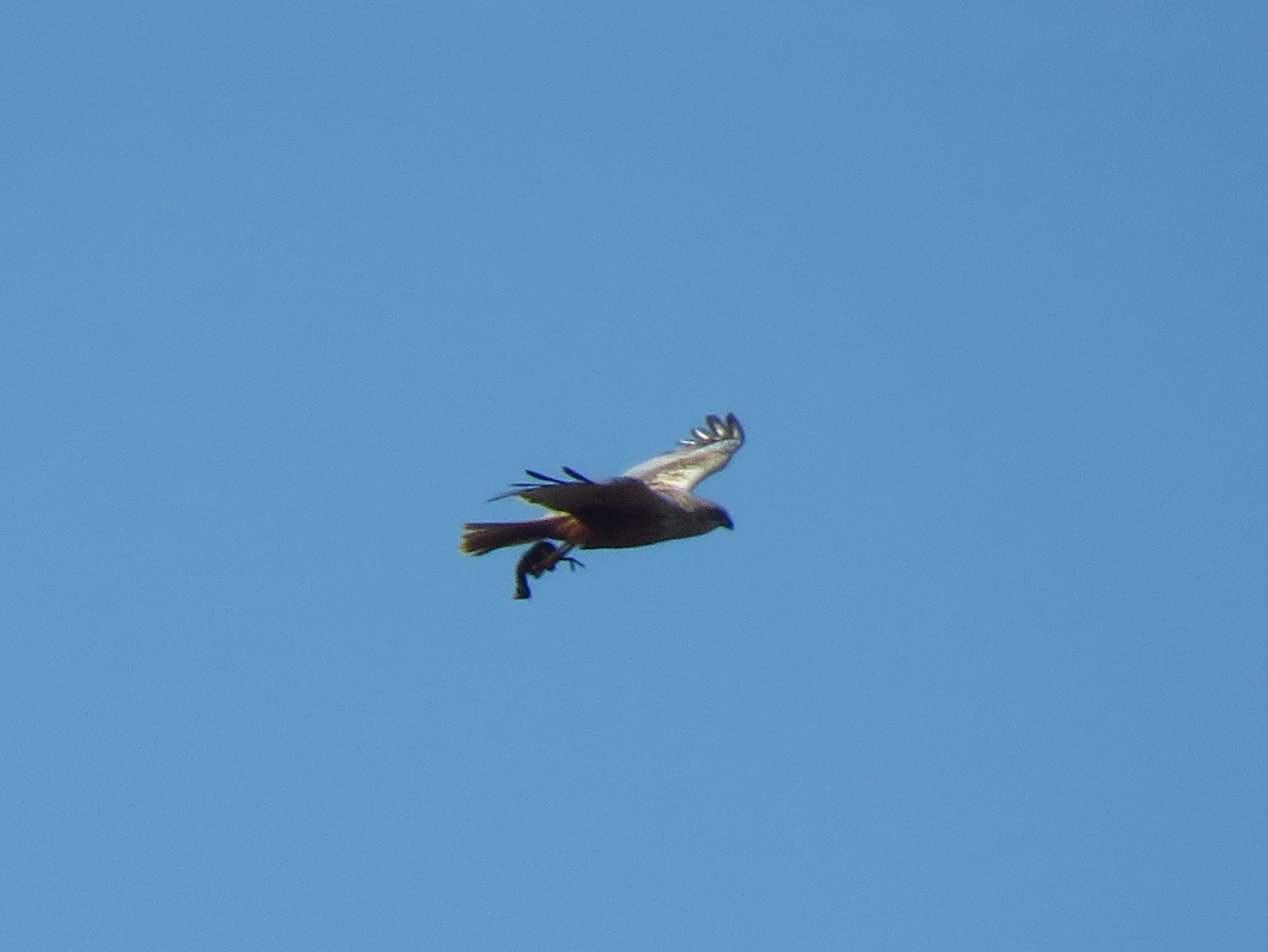 I moved on with the hope of seeing the bittern. A birdwatcher had just seen in flying into the reeds. I waited for a while but no luck. A male Marsh Harrier flew over with prey in his talons.