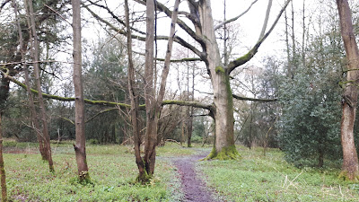 There were many Blue and Great Tits about, a single Coal Tit, Robins singing. I was very pleased to find the woodland empty of people, as the place is very popular with dog walkers. I guess the mud must be keeping them away. I'm glad I wore my wellies, as the wood was very wet and the paths muddy. With the place to myself, I walked slowly around the wood, listening to the birds, backtracking to check calls, taking everything in. As I got to the easternmost side, I heard a Nuthatch call and saw one right away, then another in a tree nearby. They fed on the trunk of the trees, and one moved to the ground before both flew away away. I took some photos but didn't follow them, I'm hoping they are a pair and they establish themselves in the wood.