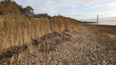 Today's was a familiar walk I've done before, from North Ferriby to St Andrew's Quay, but the conditions made it into a wonderful day, very different from my previous experience. I took the train to North Ferriby and walked straight to the Humber shore, then following the coastal footpath (shared by the Trans-Pennine Way and Wolds Way) east. The first stretch is on the foreshore itself. The tide had been high a couple of hours prior and much of the shore and mudbanks were exposed. Wigeon and Redshank were dotted all along the walk feeding near the waterline. The top of the foreshore was easy to walk on and I could explore the little patches of saltmarsh without disturbing the birds. It was mild and still, the Humber a mirror reflecting the bridge, quite a dramatic change with yesterdays stormy weather. Overhead, Pink-footed Geese calling as they crossed the Humber towards Lincolnshire.