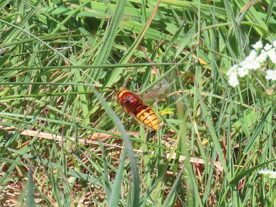 As we stood in the pasture, a queen Horned did a few fly-passes, we were awed at the sheer size of the insect. She landed on a dead birch covered on woodpecker holes and proceeded to chew the wood. The she flew to the ground under a tussock of grass.